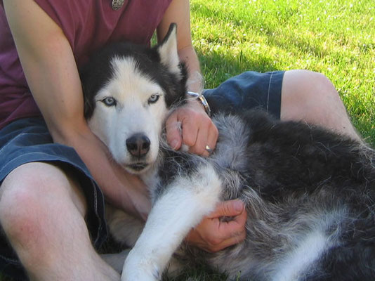 Doch auf einmal drang es in unser Bewusstsein und es war plötzlich sonnenklar, was Alaska uns die ganze Zeit hatte mitteilen wollen. Es war der Beziehungsschmerz, der Alaska auf den Magen geschlagen hatte, die Enttäuschung, dass wir uns so um ihn gekümmert und ihn schliesslich doch wieder verlassen hatten. Er würde einsam daliegend im Tierspital keine Überlebenschance mehr haben. Natürlich brauchte er medizinische Versorgung, die bekam er, aber vorallem brauchte er noch etwas anderes, und das bekam er im Tierspital nicht. Umgehend veranlassten wir eine Verlegung von Alaska zu unserem Freund in Spiez. Unserem Nachbarn wurde Alaska nicht herausgegeben, nicht mal mit unserem Einverständnis. Aber unser Freund war selber Tierarzt, und deshalb durfte er die Betreuung von Alaska übernehmen. Er nahm in privat zu sich, weil er auf Grund des Gesichtsausdrucks von Alaska davon überzeugt war, dass er eigentlich noch nicht sterben wollte. Dann, nach ein paar Tagen, als seine 13jährige Tochter am Boden liegend den Hund unter Tränen anflehte sich nicht aufzugeben, begann er ihr aus der Hand zu fressen. Ja, das Mädchen hatte dem Hund buchstäblich das Leben gerettet, nicht durch Medizin, sondern durch Liebe.