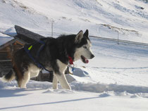 10 km und mehr bist du dem Team voraus- oder hinterher getrabt. Zwischendurch hast du dich auf dem Schlitten als Passagier mitfahrend ausruhen können. Das hat dir wohl Spass gemacht. Erst im letzten Jahr wurde dir das dann zu viel. Du hast uns deutlich gezeigt, dass du nun lieber im Auto auf uns warten möchtest.